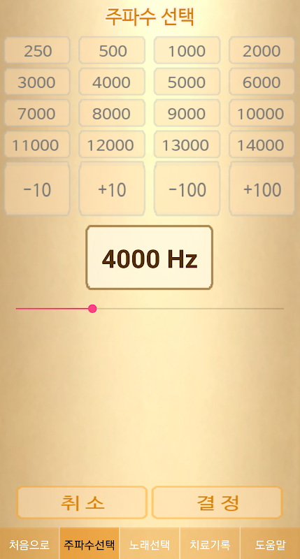 이명의 높낮이(주파수)는 가장 비슷한 소리를 고르도록 하되 처음에는 제시된 [높낮이 보기]를 들어보고 가장 유사한 주파수를 하나 골라 그 숫자를 기준으로 위 아래로 탐색해가는 것이 쉽습니다. 크기가 달라져도 마치 높낮이가 다른 것처럼 혼동할 수 있으니 크기를 잘 조정하는 것이 요령이기도 합니다. 또는 이비인후과 전문병원을 방문해서 전문가의 도움을 받아 본인의 이명 주파수를 알아내어 이 숫자를 애플리케이션에 입력하는 것도 좋은 방법입니다.