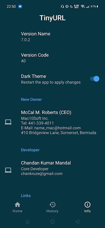 Ứng dụng này sử dụng is.gd AP để rút ngắn URL. Dịch vụ rút gọn được sở hữu và duy trì bởi is.gd.