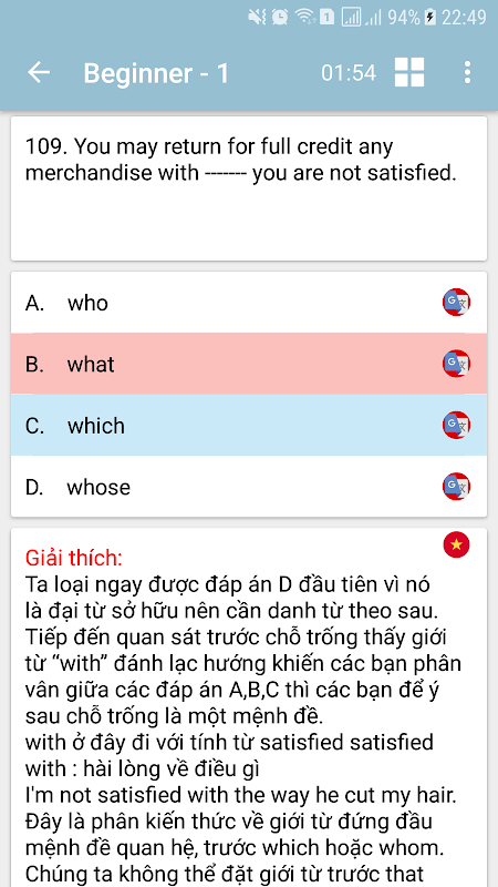- Ứng dụng giúp người dùng nâng cao khả năng nhớ từ vựng thông qua việc dịch toàn bộ câu hỏi.