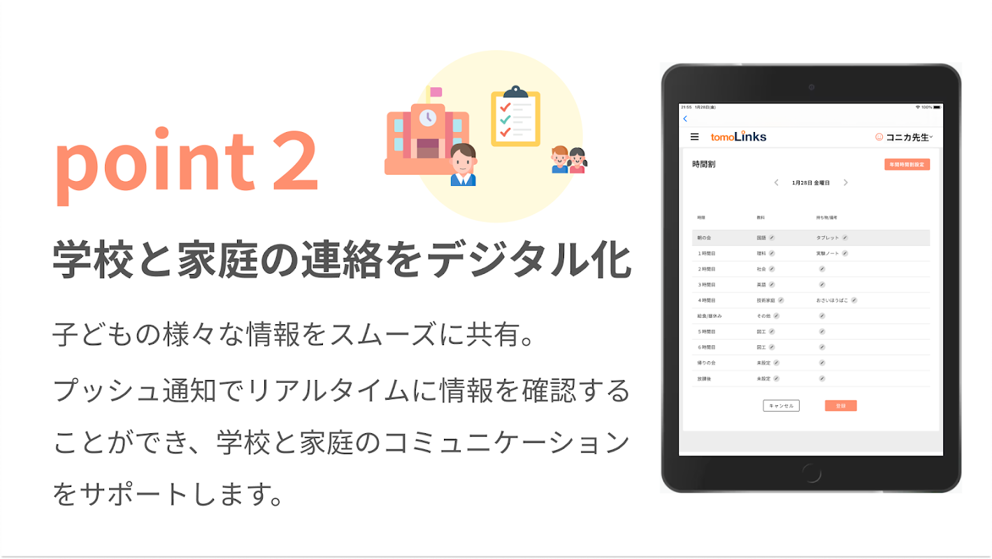tomoLinks là một dịch vụ hỗ trợ học tập tích hợp những thứ cần thiết cho đời sống học đường, chẳng hạn như sổ liên lạc, học tập hợp tác và học tập từ xa.