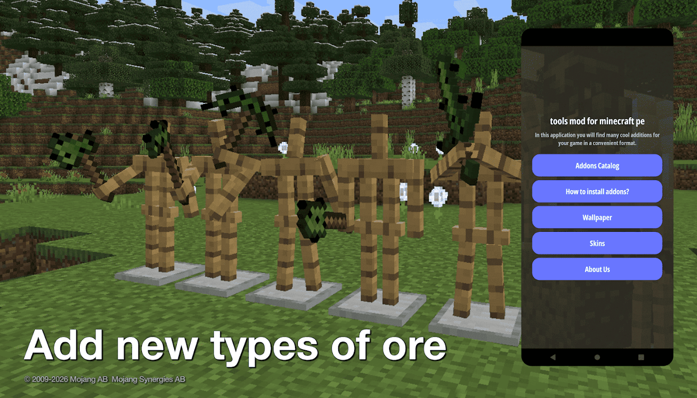 Bạn có cảm thấy mệt mỏi với mod quặng tiêu chuẩn 1.19 và tất cả các vật phẩm mà bạn có thể nhận được từ nó trong trò chơi không? Bạn có muốn thêm mod công cụ mới cho minecraft pe và các loại mod quặng mới 1.19 không? Tuyệt vời! Thêm mod cho minecraft 1.19 và bạn có thể dễ dàng làm điều đó! Với các bản mod cho mcpe 1.19, bạn có thể trở thành chủ sở hữu của kho đồ lớn nhất và đa dạng nhất với đầy đủ các công cụ cho minecraft 1.20. Thay vào đó, hãy bắt đầu trò chơi của bạn với bạn bè và làm họ ngạc nhiên với các bản mod minecraft 1.19 của chúng tôi và một bộ kiếm khổng lồ cho mcpe 1.12!
