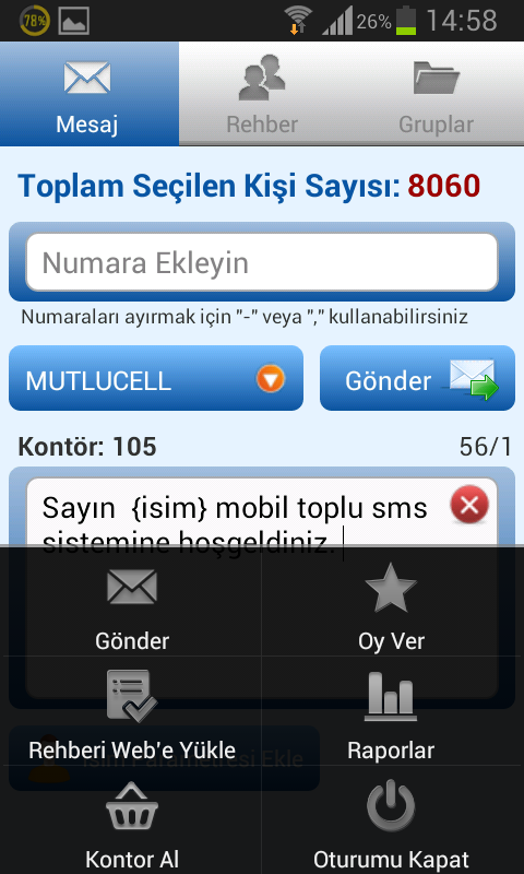 firma ünvanınız veya isminizle toplu sms gönderebilir ve rehberinizdeki kişileri mesaj gönderme programına aktarabilirsiniz.