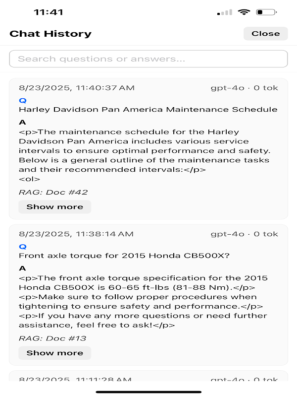 TorqueAI™ là trợ thủ đắc lực cho xe máy của bạn. Nó trả lời các câu hỏi ở cấp độ thủ công (mô-men xoắn, PSI lốp, dầu, chu kỳ) và các câu hỏi thường gặp của người lái xe — nên mua xe nào, chọn loại bánh răng nào, cách thực hiện công việc một cách an toàn, thậm chí cả những lời giải thích ngắn gọn khi bạn chỉ muốn hiểu bằng tiếng Anh đơn giản.