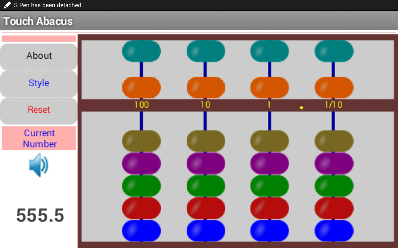 Một đơn giản cảm ứng Abacus nhắm vào sự phát triển của ý thức trong việc học toán số sớm. Bàn tính có một lịch sử lâu dài trong các nền văn hóa khác nhau và cả bê tông và trừu tượng trong một số ý nghĩa. Ứng dụng này cung cấp các phiên bản Trung Quốc và Nhật Bản. Bàn tính Trung Quốc có bảy hạt trên một thanh dọc, trong khi phiên bản tiếng Nhật có năm hạt trên một thanh dọc. Như một quy luật chung, mỗi hạt ở tầng dưới đại diện cho một trong khi di chuyển về phía chùm trung tâm. Mỗi hạt trong boong trên đại diện cho năm khi chuyển tới các chùm trung tâm. Trên bàn tính Nhật Bản, mỗi thanh có thể đại diện cho số không đến chín đơn vị. Ngược lại, bàn tính Trung Quốc cho phép các đại diện của số không qua 15 đơn vị trên mỗi thanh, do đó hỗ trợ tính toán bằng cách sử dụng hệ thống cơ-16. Đối với hệ thống cơ sở-10, hai hạt ở phía trên và phía dưới rất không được sử dụng. Về điểm thập phân, người dùng có thể, trên thực tế, chọn vị trí riêng của mình, tùy thuộc vào nhu cầu cụ thể của họ. Ứng dụng bàn tính này được phát triển bởi Tiến sĩ Lingguo Bu (
