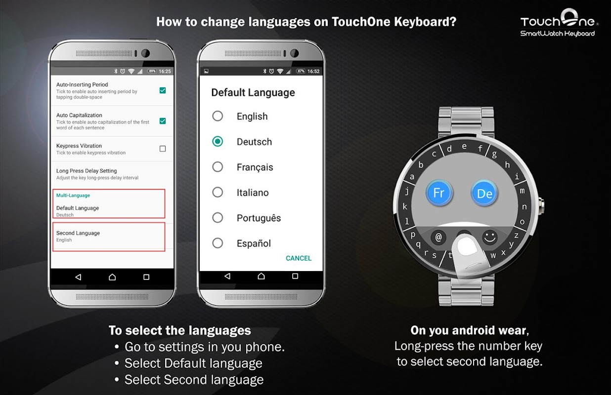 Preview version of the TouchOne Keyboard for Android WearThis preview version of the TouchOne keyboard will only allow you to use the keyboard in only some compatible Apps. To use it in Android Wear 2.0, please download it from Wear Store: https://play.google.com/store/apps/details?id=net.infiniti.touchone.nimbusor search for TouchOne Keyboard in Android Wear 2.0 Store Multi-Languages is supported for the following languages: French German SpanishItalian Portuguese EnglishTo select the languages1. Go to settings in you phone.2. Select Default language 3. Select Second language On you android wear, Long-press the number key to select second language.Media reviews of the TouchOne Keyboard Cnet Japan – “The only smartwatch keyboard”Yahoo – “Designed to maximize your smartwatch’s scant screen real estate”Wareable – “TouchOne Keyboard may actually make smartwatch typing possible”Geeky Gadgets – “It can make typing on the smaller screen wearable devices a little easier”Digital Trends – “This smartwatch keyboard could be a qwerty killer”Trusted Reviews – “An intuitive typing aid for your smartwatch”About the TouchOne KeyboardThe TouchOne Smartwatch keyboard makes typing messages on a smartwatch both fast and intuitive. The TouchOne keyboard is also the first and only full keyboard solution on the Google Play Store with number, punctuation and emoji support. With the support of scientific human finger ergonomics research and an award winning patented design, the TouchOne keyboard has been developed with enhanced features from the T9 keyboard. Users with naturally large fingers will have no trouble using the TouchOne keyboard on small screens, as the keys on the TouchOne keyboard are finger sized keys. The keyboard will be able to smartly predict and autocorrect the words typed in. The multi patent sleek and innovative design has the following built in features below:► A dedicated design to support all small devices, tested and proven to fit any screen size down to 1.18 inches► Compatible with most of Android Smartwatches, from square to circular► A Full keyboard solution for small screens with Number, Punctuation and Emoji► Themes Selection available for the Paid version► Finger sized keys, certified for large fingers► Designed for human's finger ergonomics► One touch typing experience, easy and intuitive► 80% of watch face is used for text display ► Keys surrounded screen, high accuracy input rateThe common gestures built in the TouchOne Keyboard include:SWIPE LEFT to DeleteSWIPE UP to ShiftSWIPE DOWN to EnterSWIPE RIGHT to Finish typing and exit the keyboardThere are more hidden gestures for fast typing, please check Advanced Tips for more information.The following top rated apps will support TouchOne Keyboard: • Messages for Android Wear: Use this messenger for SMS, Hangouts, WhatsApp or Facebook conversations on your Android Wear smartwatch• Web Browser for Android Wear: The Android Wear Internet Browser• Mail for Android Wear & Gmail: Reply to your emails from your Android wear• Video/YouTube for Android Wear: Video player for smartwatches, powered by YouTube• Photo Gallery for Android Wear: View your photos on your smartwatch• Documents for Android Wear: View PDFs and other documents from your phone or Google Drive on your smartwatch• Calendar for Android Wear: Complete calendar app for your Android Wear• Wear Messenger: SMS texting app • Quick for Wear: Messaging for WhatsApp, Hangouts, Gmail, Telegram, Facebook Messenger, Threema, and ViberFeel free to give us feedback to [email protected]