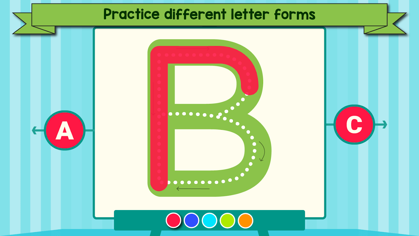 ☛Ứng dụng tô theo này được thiết kế để giúp tăng cường sự phối hợp tay mắt của trẻ mới biết đi và trẻ mẫu giáo và giúp chúng vẽ các đường thẳng, đường cong và một số hình dạng cơ bản để chúng có thể làm quen với khái niệm viết mà không làm chúng choáng ngợp. Mỗi trẻ có thể học theo tốc độ của riêng mình trong khi vẫn vui chơi. Phù hợp với trẻ mẫu giáo từ 3 đến 6 tuổi và cũng giúp chúng cải thiện chữ viết tay cũng như hiểu biết về âm thanh ngữ âm và tô theo chữ cái. Ứng dụng có một số trò chơi giúp trẻ nhận biết hình dạng, liên kết bảng chữ cái với âm thanh ngữ âm của chúng. Trẻ em có thể học tiếng Anh và bảng chữ cái tiếng Anh bằng trò chơi trực tuyến miễn phí này.