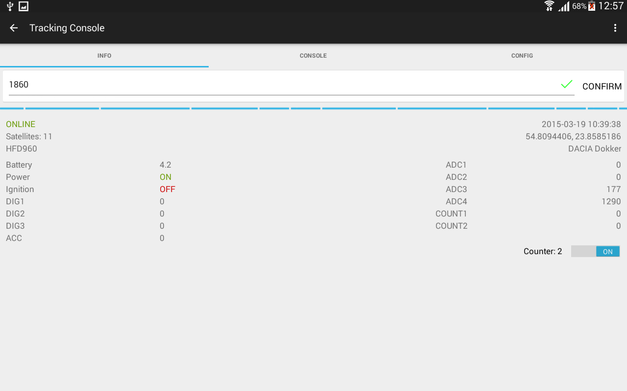 This is an application to manage, configure and test trackers, mounted by company Simbiotecha to clients. With unique identification users have to log in to access the application functions. Users can ping the devices, check their status, speed, car license or location in Google Maps. Console screen provides engineers and administrators direct communication with tracker with populated list of commands.