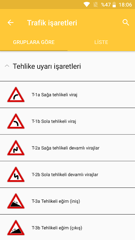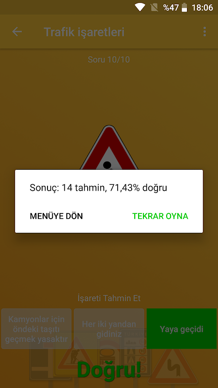 Đây là cuộc thử nghiệm trên biển báo đường bộ của Thổ Nhĩ Kỳ. Trong ứng dụng này, bạn có thể học các biển báo giao thông một cách thú vị. Kỳ thi này sẽ chỉ hữu ích cho những người mới bắt đầu dự định lấy bằng lái xe và những người lái xe có kinh nghiệm để làm mới bộ nhớ của mã Giao thông.