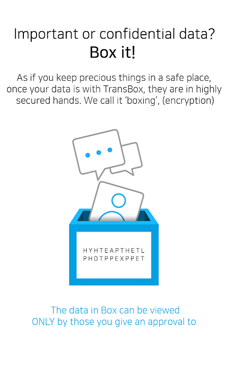 The data protection in TransBox is called box or boxing. After you box your data, the data is encrypted and you can easily share the box by utilizing the means of online chat, emails, SNS, and all other available online services today. Versatile secure data sharing.