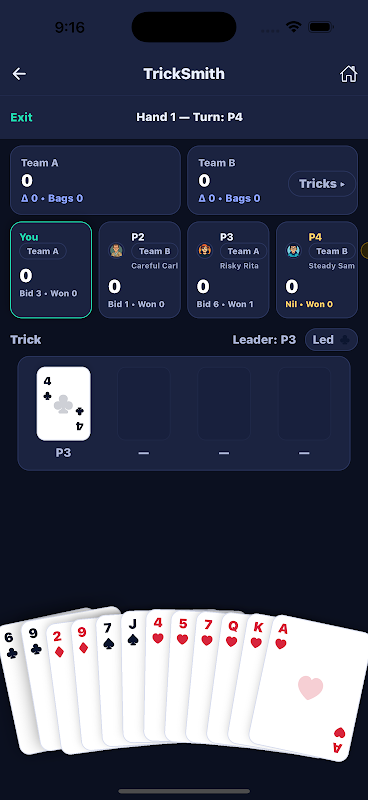 Rèn luyện kỹ năng bắt bài của bạn với TrickSmith — một ứng dụng Spades & Hearts ngoại tuyến hiện đại, được thiết kế cho các ván chơi nhanh, chiến thuật sâu sắc và giao diện người dùng rõ ràng, dễ đọc.
