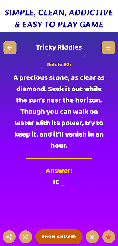 Dù bạn thích những câu đố vui nhộn, câu đố kinh điển hay những câu hỏi logic hóc búa, Tricky Riddles: Brain Teasers đều có nội dung dành cho tất cả mọi người. Hãy tư duy đột phá, đoán đáp án và trở thành bậc thầy giải đố thực thụ!