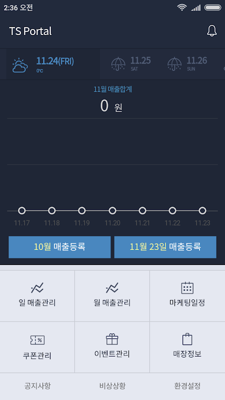매장의 '매출 등록'을 통해 매출을 관리하고 매출 분석 및 통계 지표를 제공합니다.