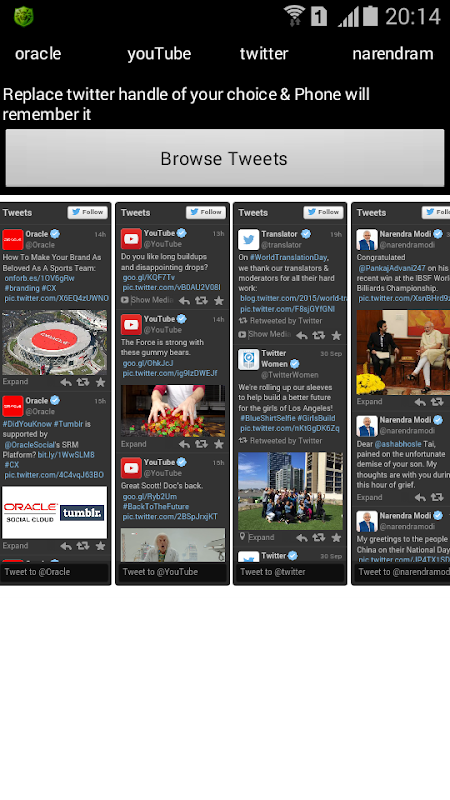 Use the App to browse tweets from twitter handles of your choice. Users choice will be stored in the phone when default is replaced.