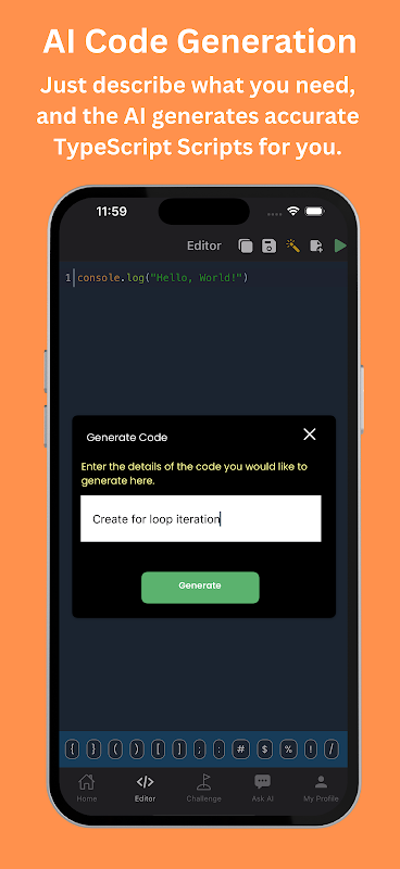 Tích hợp AI: AI của ứng dụng cung cấp cho bạn phản hồi được cá nhân hóa, giúp bạn tạo mã và sửa lỗi, giúp việc học nhanh hơn và hiệu quả hơn. Cho dù bạn đang sử dụng TS Editor hay TypeScript IDE, AI sẽ hướng dẫn việc học của bạn bằng các giải pháp tùy chỉnh.