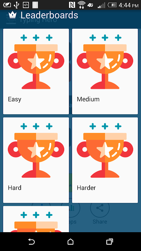 Typing Hero has different types of typing difficulties like Easy, Medium, Hard, and Harder. Text will be displayed based on this selection. This shows your confidence and your typing level on mobile or tab.