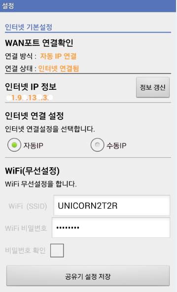 유니콘 정보시스템 공유기 간단 설정 앱입니다.