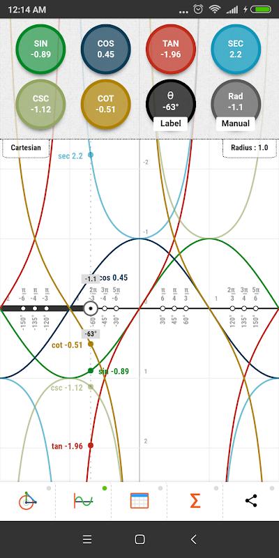 Ứng dụng này chủ yếu giao dịch trên vòng tròn đơn vị Trigonometry. Nó chứa một vòng tròn đơn vị tương tác cho tất cả các chức năng trang điểm như sin, cos, tiếp tuyến, đường cát tuyến và côsec cho cả mức độ và radian giữa 0 và 360 độ. Nó cũng chứa các biểu đồ tương tác cho tất cả các chức năng trang điểm đã nêu ở trên giữa -180 đến 180 độ. Nó cũng được cung cấp với bảng trang điểm tỷ lệ cho tất cả các chức năng trang điểm 0-360 độ với thặng dư 15 độ. Là một bổ sung, ứng dụng này cũng được cung cấp với một số công thức lượng giác quan trọng và bản sắc.