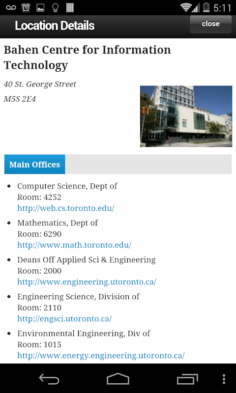 Google dựa trên bản đồ lớp này được thiết kế cho Android sẽ giúp các thành viên của U của T cộng đồng, đặc biệt là những người mới đến trường (St George, Mississauga hoặc Scarborough), điều hướng sử dụng những từ tìm kiếm có ý nghĩa, chẳng hạn như "thư viện" và "Đăng ký". Các lớp bản đồ đầu tiên bao gồm khả năng tiếp cận, thực phẩm, không dây, dịch vụ sinh viên (bao gồm cả đăng ký), bãi đậu xe, giá đỡ xe đạp, trạm tàu điện ngầm TTC, các trang web màu xanh lá cây (bao gồm cả mái nhà màu xanh lá cây và các trang web pin thả-off), an toàn, không gian nghiên cứu và nhà vệ sinh. Bản đồ bao gồm một danh sách đầy đủ của tất cả các tòa nhà với các thông tin về văn phòng và các dịch vụ có sẵn bên trong chúng. Nó là một bản đồ sống, một trong đó sẽ phát triển lớp hơn vì nó phát triển.