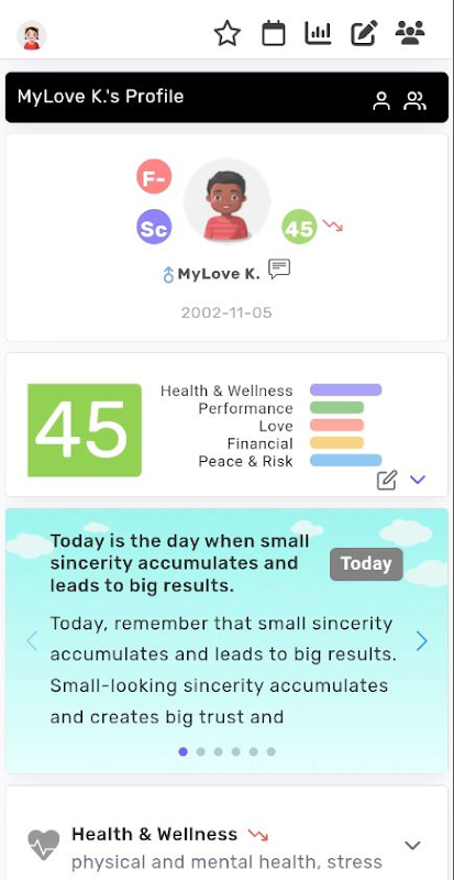 Thông qua phân tích phức tạp dựa trên bốn trụ cột của số phận và các chòm sao, nó hình dung ra tình trạng toàn diện được tùy chỉnh và năm điều kiện chính (sức khỏe, hiệu suất, tình cảm, tài chính, rủi ro) của các cá nhân và những người khác trong thời gian thực, đồng thời cung cấp Hướng dẫn và Sứ mệnh cho tình trạng LÊN . Nó cũng cung cấp thông tin hóa học giữa hai người trong thời gian thực. Ghi lại cảm xúc và nhật ký của bạn mỗi ngày và quản lý tình trạng toàn diện của bạn bằng cách sử dụng thông tin ngày sinh và thông tin cảm xúc của bạn thông qua chức năng ghi nhớ mọi lúc.
