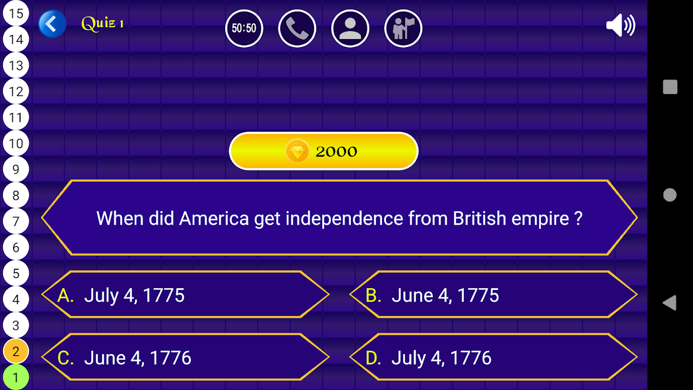There are four lifelines to help the player winning the quiz. These lifelines are 50-50, ask a friend using messaging apps like whatsapp, facebook, etc, expert opinion and audience poll.