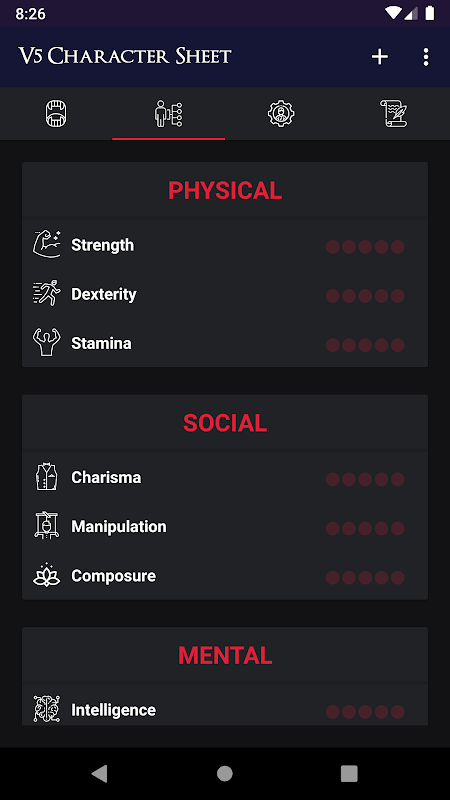 - "Kỹ năng Tab": đề cập đến các kỹ năng, cũng như thể chất, xã hội và tinh thần mà ma cà rồng của bạn sở hữu.