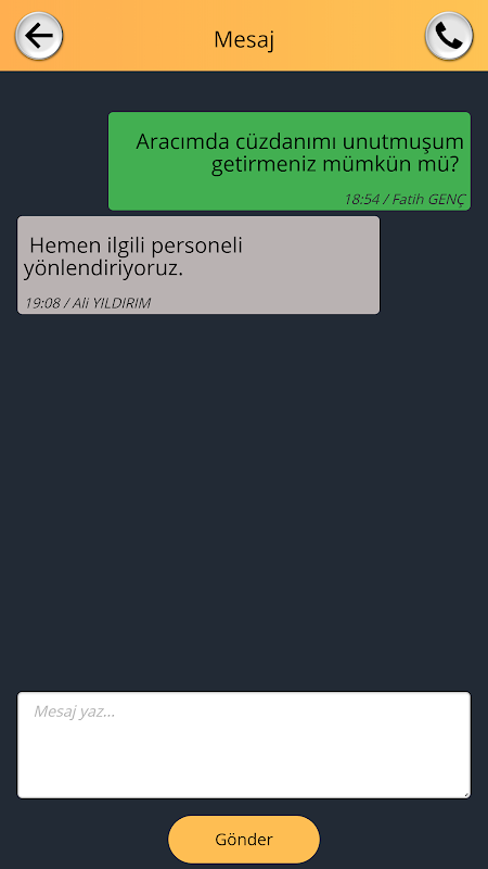 Uygulama ile aracınızı teslim alan ve getiren personele istediğinizde telefon ile ulaşabilir veya uygulama üzerinden mesajlaşabilirsiniz.