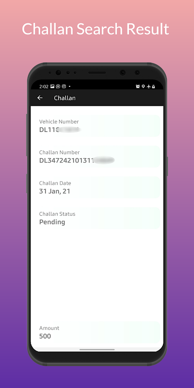 Tìm kiếm Challan: Nó cung cấp Thông tin về Challan có sẵn trên xe và ngày thanh toán. Người dùng phải nhập số xe vào hộp tìm kiếm