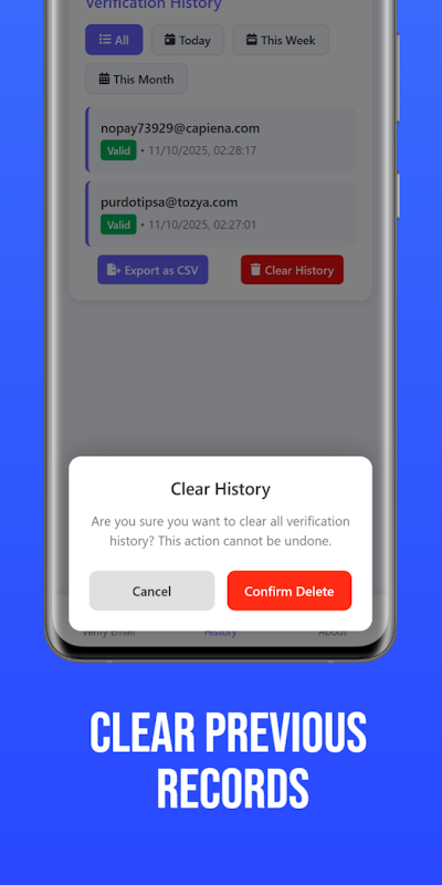 Bạn cũng có thể theo dõi lịch sử xác minh, xem kết quả chi tiết và thậm chí xuất hồ sơ xác minh dưới dạng tệp CSV để phân tích sau này hoặc báo cáo chuyên nghiệp. Cho dù bạn đang dọn dẹp danh sách gửi thư hay chỉ kiểm tra email trước khi gửi, công cụ này đều giúp bạn thực hiện dễ dàng, nhanh chóng và chính xác.