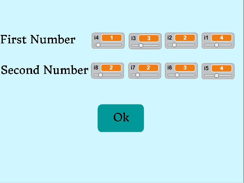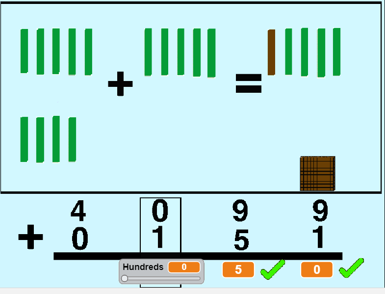 This is a game about Vertical Addition. We have two buttons at the start of the game. If we press the one button we create our two 4-digit addends by moving a slider or if we press the other button we make addition with two numbers chosen by using random choice. The student must find every digit of the sum. He chooses the number by using a slider. The game asks in sequence the digits for ones, tens, hundreds and thousands. After every answer the student will see in the top of the screen a visualisation of a standard algorithm of addition with base ten blocks for ones, tens, hundreds and thousands. This is a helpful teaching resource for Teachers, Parents and Students