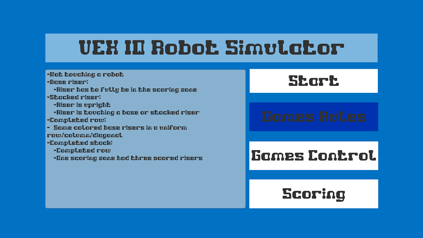 Each Vex iq robot is a unique build, with unique controls and capabilities. I have simulated a particular version of the Vex IQ robot which can be used to move the risers into the correct locations and arrangements following the Vex IQ scoring rules and regulations.
