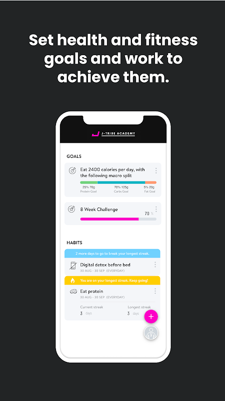 Với ứng dụng J Tribe Academy, bạn sẽ được tiếp cận các chương trình tập luyện được thiết kế riêng để giúp bạn đạt được mục tiêu thể chất và sức khỏe! Chương trình Huấn luyện Cuộc sống (Life Coaching) được tích hợp sẵn trên ứng dụng giúp việc theo dõi trở nên dễ dàng và có cấu trúc. Bạn có thể theo dõi và cập nhật các bài tập, chế độ dinh dưỡng, thói quen lối sống, số đo và kết quả của mình - tất cả đều có sự hỗ trợ của huấn luyện viên.