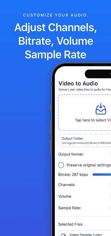 Video to Audio Converter Unlimited là ứng dụng chuyển đổi âm thanh tối ưu của bạn, cho phép bạn chuyển đổi liền mạch bất kỳ tệp Video nào thành Âm thanh mà không bị giới hạn. Cho dù bạn là nhà sản xuất âm nhạc, người sáng tạo nội dung hay đơn giản là người yêu thích âm thanh chất lượng cao, ứng dụng này đều cung cấp giải pháp dễ sử dụng cho mọi nhu cầu chuyển đổi âm thanh của bạn. Với các tùy chọn có thể tùy chỉnh, bạn có thể thay đổi kênh âm thanh, âm lượng, tốc độ mẫu và tốc độ bit, giúp bạn kiểm soát hoàn toàn các tệp âm thanh của mình.