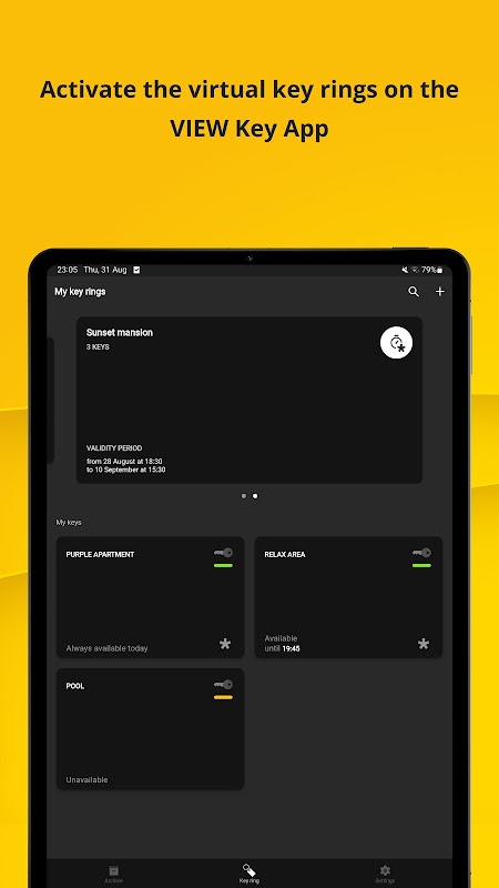 Ứng dụng View Key được thiết kế để quản lý quyền truy cập, dành cho khách và nhân viên tại các cơ sở lưu trú. Nó cấp quyền truy cập vào các phòng và khu vực chung thông qua điện thoại thông minh và kết nối Bluetooth của hệ thống View Wireless.