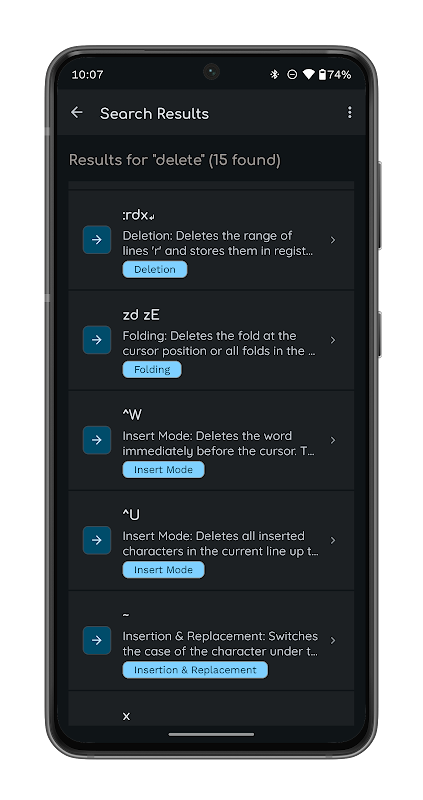 Ứng dụng của chúng tôi bao gồm nhiều lệnh khác nhau, bao gồm lệnh điều hướng cơ bản, lệnh chỉnh sửa nâng cao và thậm chí cả lệnh để tùy chỉnh Vim theo nhu cầu cụ thể của bạn. Ngoài ra, với các giải thích và ví dụ hữu ích của chúng tôi, bạn sẽ có thể thành thạo ngay cả những lệnh phức tạp nhất ngay lập tức.