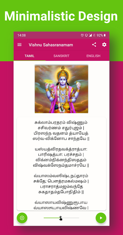 🚀 Vishnu Sahasranamam được trình bày bằng 3 ngôn ngữ Ấn Độ khác nhau - tiếng Hindi (tiếng Phạn), tiếng Tamil và tiếng Anh. Ứng dụng sẽ ghi nhớ sở thích của bạn.