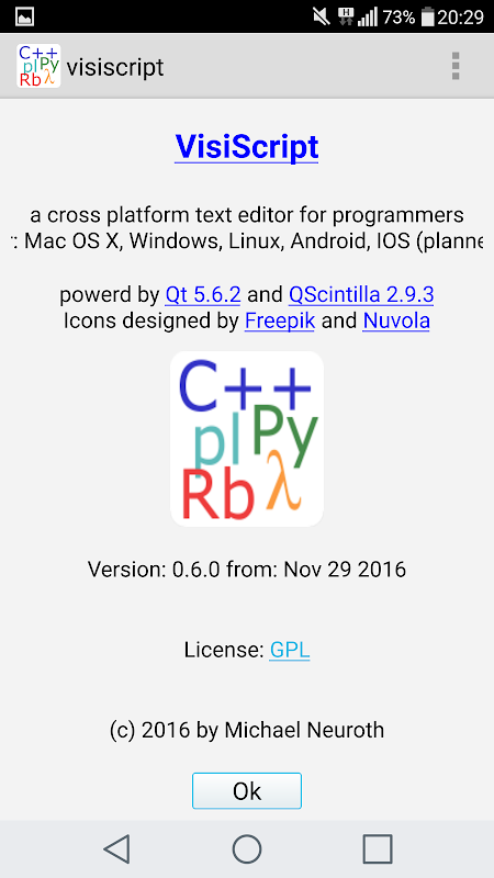 Đối với các chức năng nâng cao (điều hướng trong mã nguồn, tìm trong tệp, mã hóa tệp, đầu ra đồ họa và hỗ trợ trình gỡ lỗi cho Python và minscript) và trình thông dịch tập lệnh bổ sung (minscript, Lua, Python, Haskell / Hugs, Scheme / Scheme48, newLisp), hãy sử dụng VisiScriptExtensions mô-đun: https://www.google.com/url?q=https://play.google.com/store/apps/details?id=de.mneuroth.visiscriptextensions