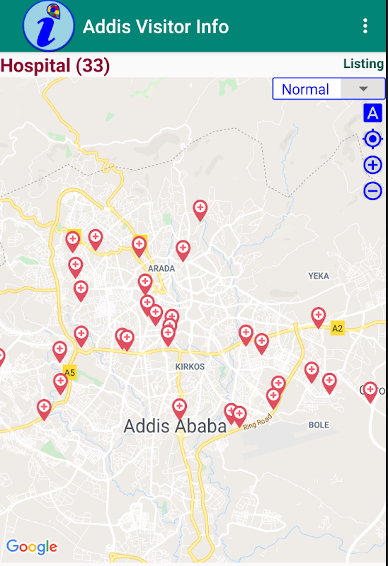 Thông tin khách truy cập Ứng dụng Addis Ababa có thể được sử dụng để định vị một số vị trí chính trong Addis