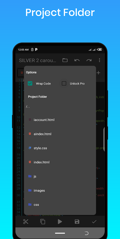 Visual Code Editor : Mobile websites Builder is an optimized text focused on coding. It is an handy tool for development on a Android. Quickly change code snippets, preview them, and maximize coding level even with our in-built JavaScript IDE.