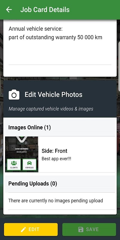 Ứng dụng VMG Workshop Mobile cho phép nhóm của bạn mở và chỉnh sửa Khách hàng, Phương tiện, Đặt chỗ và Thẻ công việc. Nó cũng cho phép nhóm hội thảo của bạn thêm hình ảnh Xe vào Thẻ công việc. Những hình ảnh được đóng dấu ngày và thời gian này sau đó có thể được gửi cùng với dữ liệu Thẻ công việc cho khách hàng của bạn qua email. Chụp ảnh Xe khi họ đến sẽ bảo vệ bạn và khách hàng của bạn khỏi việc xác định nhầm thiệt hại cho Xe mà bạn hoặc khách hàng của bạn có thể cảm thấy là do các thành viên trong nhóm xưởng của bạn gây ra.