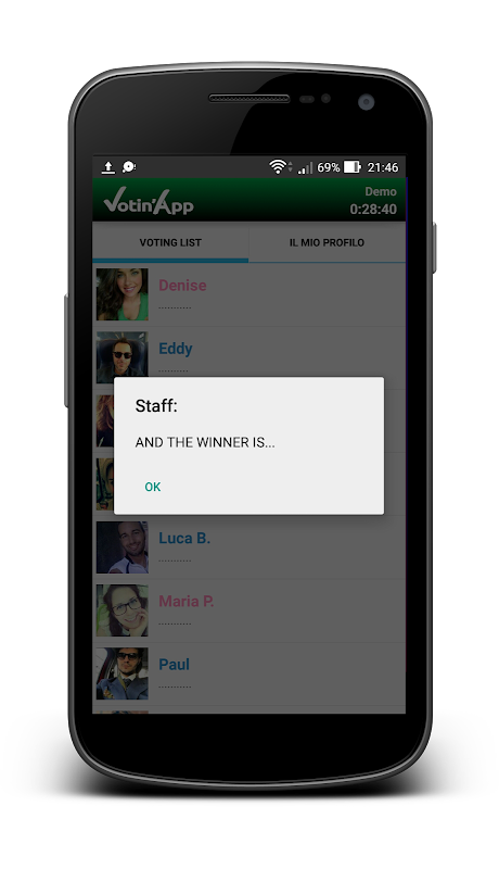 Accedi alla votazione dell’evento a cui partecipi inserendo la chiave d’accesso che ti forniranno gli organizzatori dell'evento stesso, scegli il tuo candidato preferito e dagli il tuo voto o giudica attraverso il rating assegnando le tue stelle ai vari sfidanti. Il risultato ti sarà comunicato dallo Staff attraverso un messaggio pop-up direttamente sul tuo smartphone!