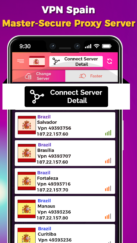 browsing with VPN Spain Master-Secure Proxy Server is the fastest network of any Spain country. Find all latest information like news, videos and many more sites related to Spain country. An application can particularly design considering the Intuitive User Interface while using it. your device and network are safe to use while you using or connected with any servers.