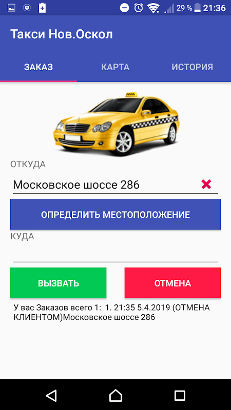 Данное приложение несет основной функционал для вызова такси и отображения состояния заказа, который клиент пожелал сделать в службе такси.