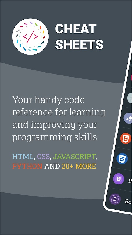 This app contains cheat sheets to help you learn and remember the code for HTML, JavaScript, Python and 20+ programming languages. (see the full list bellow).