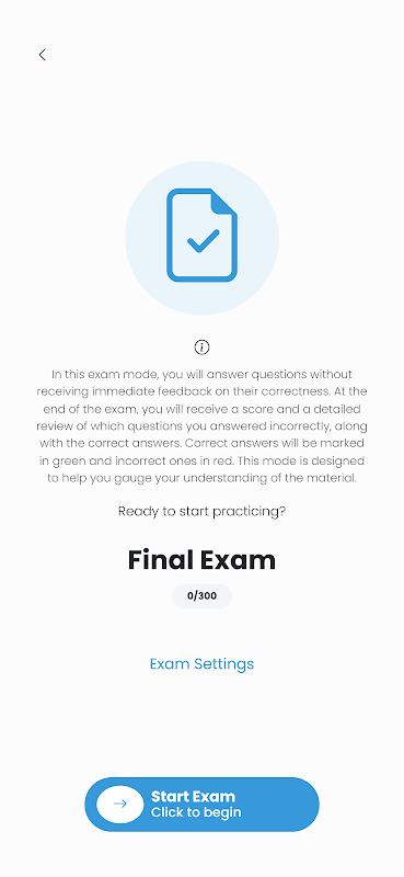 Kiểm tra kiến thức của bạn trong điều kiện thi thực tế. Ở chế độ này, bạn sẽ trả lời các câu hỏi mà không nhận được phản hồi ngay lập tức. Khi kết thúc bài thi, bạn sẽ nhận được báo cáo điểm chi tiết, nêu bật những câu hỏi bạn trả lời sai và cung cấp câu trả lời đúng. Những câu trả lời đúng được đánh dấu bằng màu xanh lá cây và những câu trả lời sai được đánh dấu bằng màu đỏ, giúp bạn xác định những phần bạn cần xem xét thêm. Chế độ này hoàn hảo để đánh giá mức độ sẵn sàng tổng thể của bạn cho kỳ thi thực sự.
