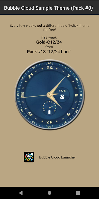 Nếu bạn thích chủ đề của tuần, bạn nên cài đặt gói chủ đề có chứa chủ đề đó. Chủ đề miễn phí của tuần này là từ Gói chủ đề #13 với 4 mặt đồng hồ tương tự 12/24 giờ: https://play.google.com/store/apps/details? id=dynalogix.bubblecloud.themepack13 (giá chỉ $1,19)