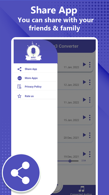 1. Công cụ chuyển đổi Wav / WAV sang Mp3 miễn phí cho Android cho phép người dùng phát và chuyển đổi bất kỳ tệp WAV nào thành Mp3 từ thiết bị của họ. Tải xuống ứng dụng chuyển đổi wav sang mp3 có hai tính năng chính: Âm thanh WAV và Âm thanh được chuyển đổi.