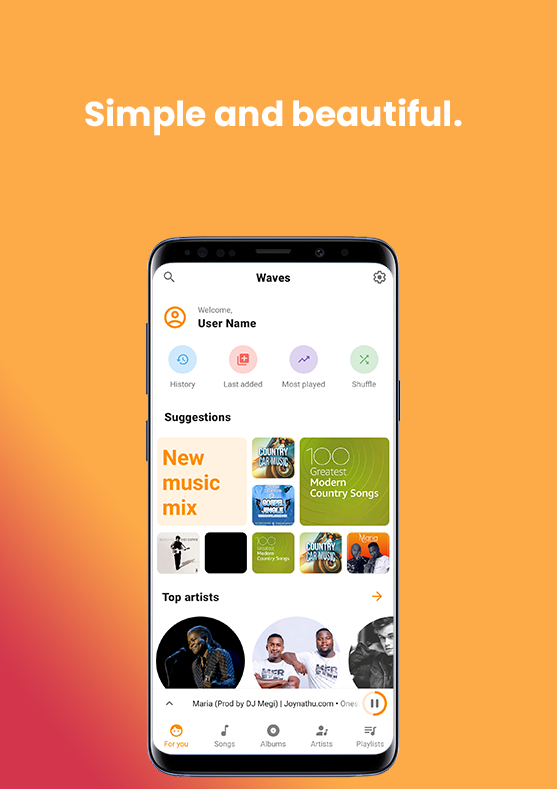 Máy nghe nhạc Waves là máy nghe nhạc & máy nghe nhạc MP3 tốt nhất, miễn phí 100%, nó có thể phát ngoại tuyến tất cả các định dạng nhạc chính trong thiết bị Android của bạn, vì vậy bạn có thể thưởng thức âm nhạc mọi lúc, mọi nơi.