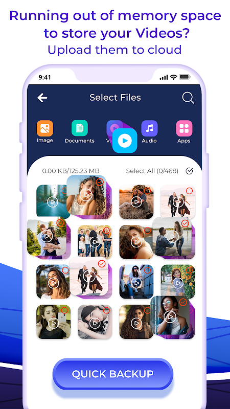 Quick Backup có thể khôi phục các tập tin đã xóa khỏi điện thoại của bạn và dễ dàng hỗ trợ người dùng tạo các tập tin sao lưu lưu trữ và đồng bộ hóa dữ liệu. Bạn có thể chia sẻ các tệp này với những người khác có kết nối internet. Lưu trữ đám mây máy chủ dễ dàng và tốt nhất cho ảnh và video để sử dụng sau này. Bạn có thể tải lên các hình ảnh, video và tài liệu khác nhau trên ổ lưu trữ này.
