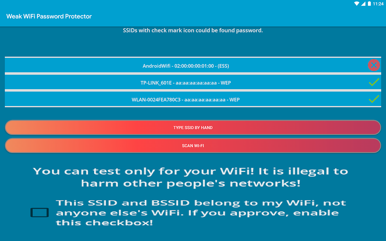 Ứng dụng này không dùng để bẻ khóa hoặc hack bất kỳ loại mật khẩu Wi-Fi nào nếu việc sử dụng sai ứng dụng này, nhà phát triển sẽ không chịu trách nhiệm.