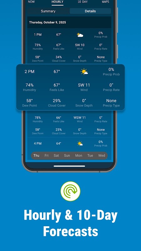 • Theo dõi thông tin Chỉ số UV, tốc độ gió, quan sát thời tiết trực tiếp và dữ liệu dự báo thời tiết